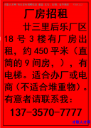 厂房招租 廿三里后乐厂区18号3楼有厂房出租,约450平米(直筒的9间房,),有