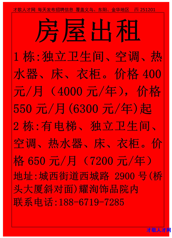 房屋出租 1栋:独立卫生间、空调、热水器、床、衣柜。价格400元/月(4000元 - 住房 - 才歌网