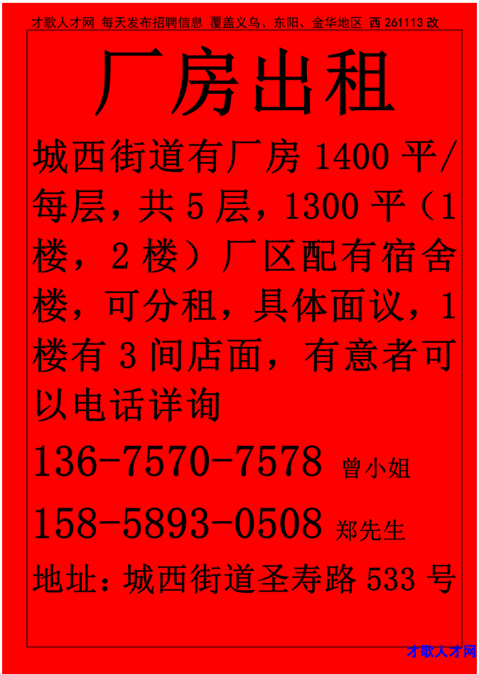 厂房出租 城西街道有厂房1400平/每层,共5层,1300平(1楼,2楼)厂区配 - 厂房 - 才歌网