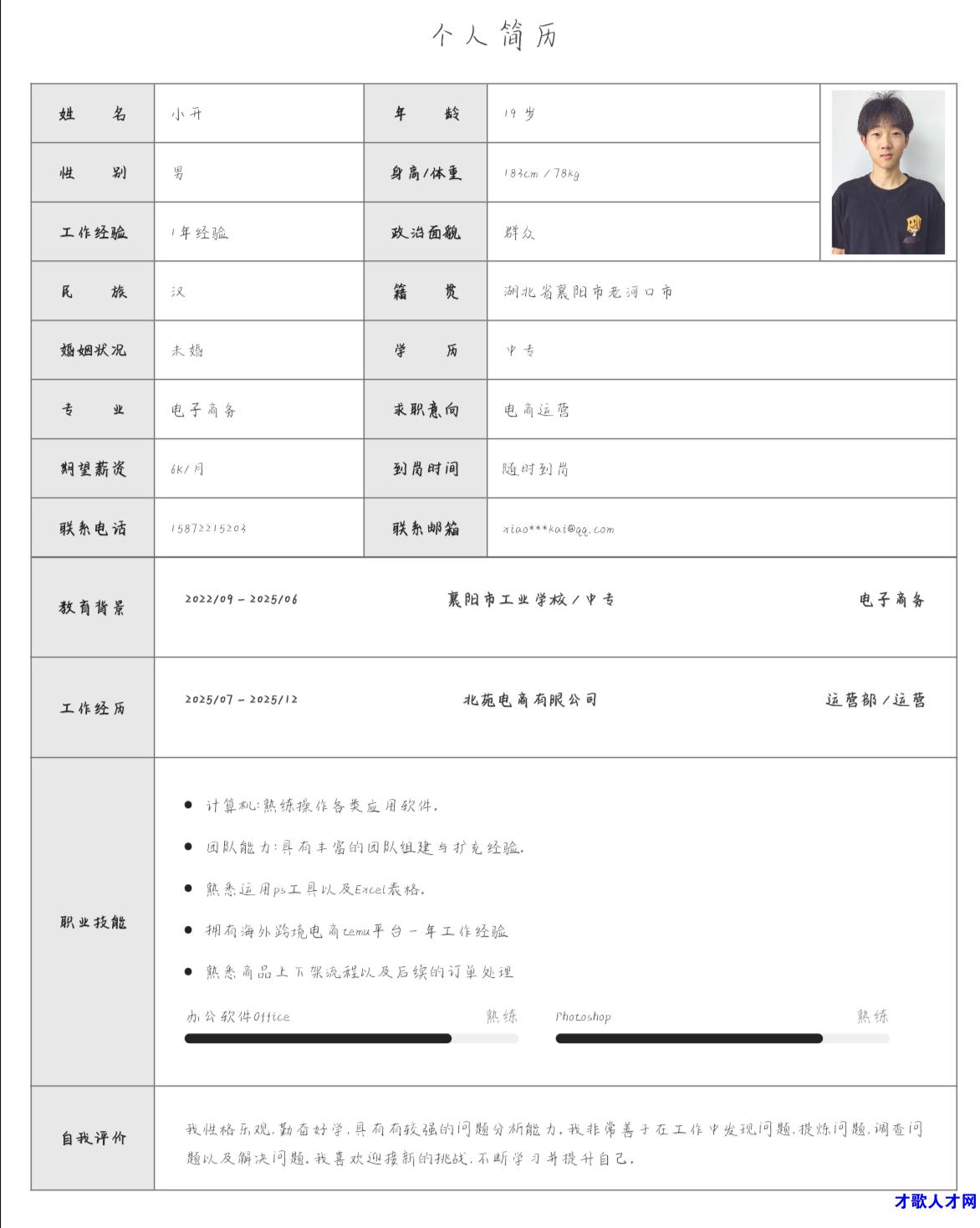 计算机:熟练操作各类应用软件。 团队能力:具有丰富的团队组建与扩充经验。熟悉运用ps工具以及Encel表格。 拥有海外跨境电商temu平台一年工作经验 熟悉商品上下架流程以及后续的订单处理