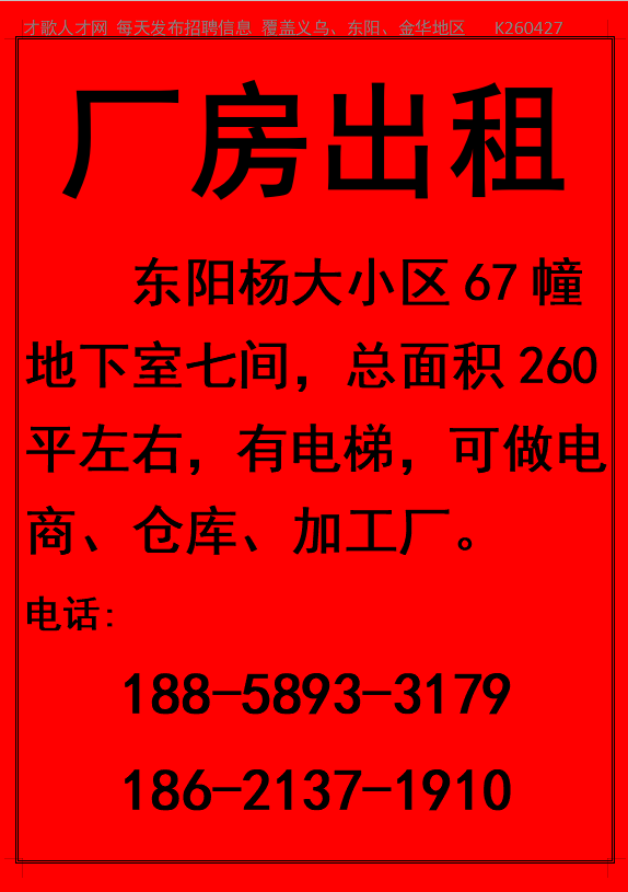 东阳杨大小区67栋地下室七间260平出租 - 厂房 - 才歌网