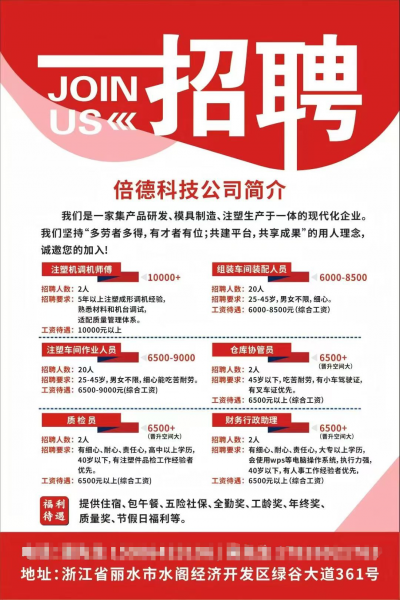 5年以上注塑成形调机经验,熟悉材料和机台调试,适配质量管理体系,工资10000元以上